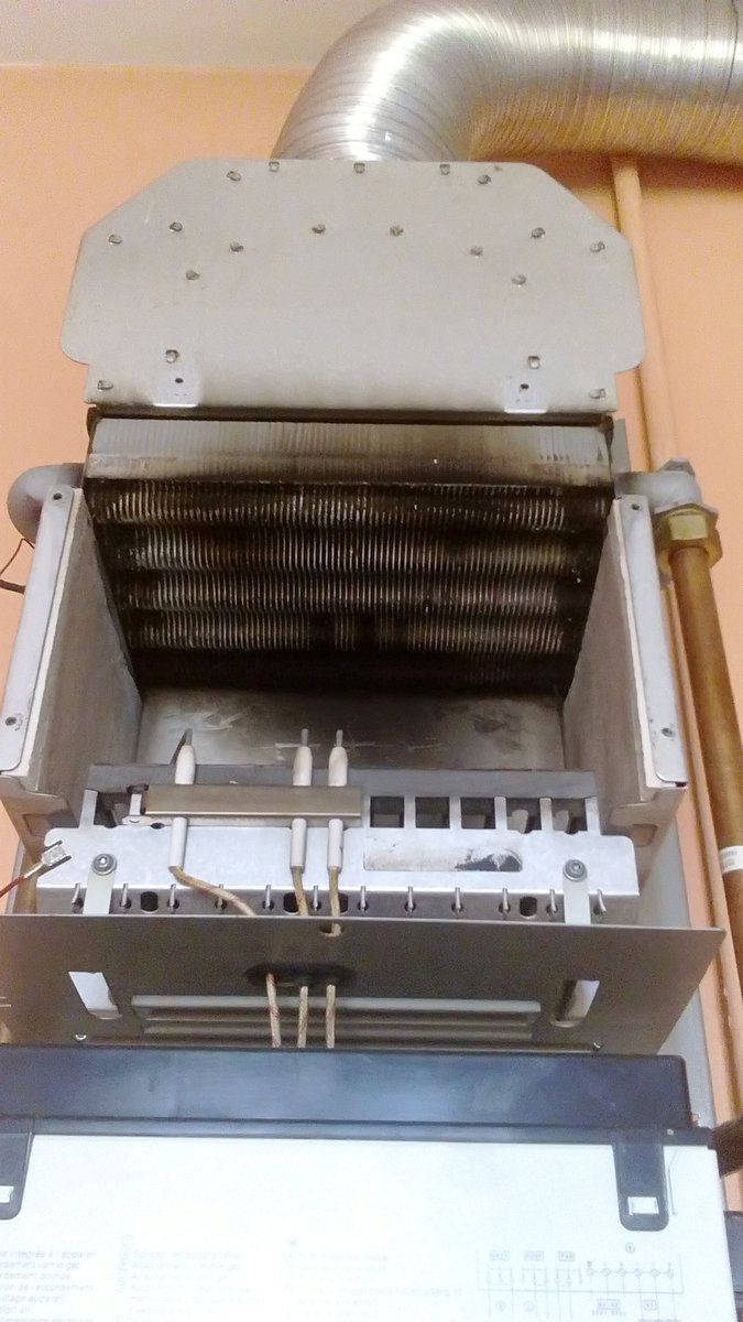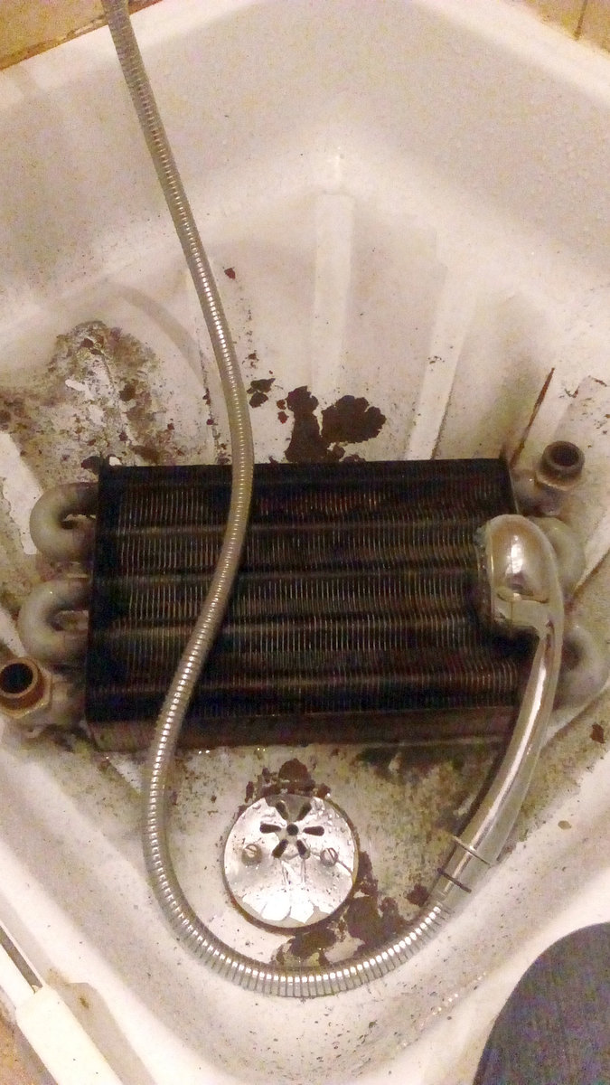 W trakcie tej naprawy konieczny był demontaż nagrzewnicy i szczotkowanie pod bierzącą wodą. Niestety niedbale wkonywane przeglądy tworzą złudne poczucie bezpieczeństwa i są żródłem wielu nieszczęść. Zlecając konserwacje lub serwis kotła warto przyjrzeć się czy praca wykonana jest należycie dokładnie. W końcu efektem konserwacji powinna być bezpieczna praca kotła przez okres minimum 12 miesięcy od przeglądu. Dodatkowo na zdjęciu widoczna jest nieatestowana, aluminiowa rura spalinowa. Zalecono wymianę rury na kwasoodporną oraz montaż czujnika tlenku węgla. Przypadek w którym taki czujnik uratował życie domowników opisujemy TUTAJ.